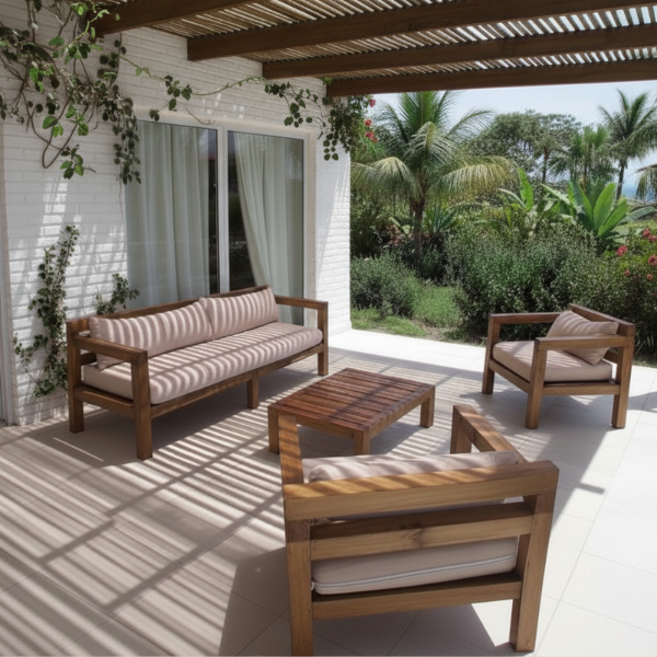 El Juego de Sillones Positano está hecho para disfrutar el exterior con elegancia. Fabricado en madera maciza de petiribí, ofrece resistencia, diseño y una calidez única que se adapta a cualquier ambiente: galerías, terrazas o livings con aire natural.