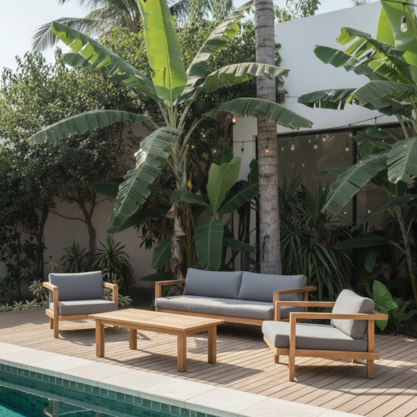 El Juego de Sillones Sorrento combina diseño contemporáneo con materiales nobles. Fabricado en madera de petiribí laqueada, ofrece una estructura sólida y cálida que se adapta tanto a livings interiores como a galerías o terrazas semicubiertas.